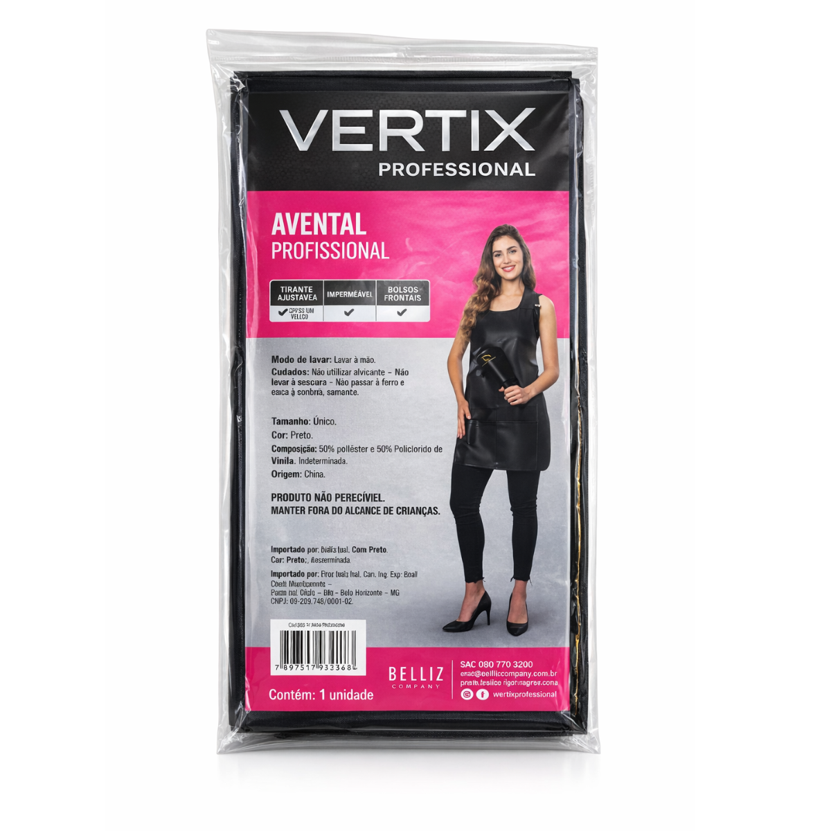 O Avental Profissional Vertix foi desenvolvido para oferecer praticidade, proteção e conforto no dia a dia dos profissionais da beleza. Com design moderno e funcional, ele conta com bolso frontal, ideal para armazenar acessórios e ferramentas essenciais, facilitando o manuseio durante o trabalho.