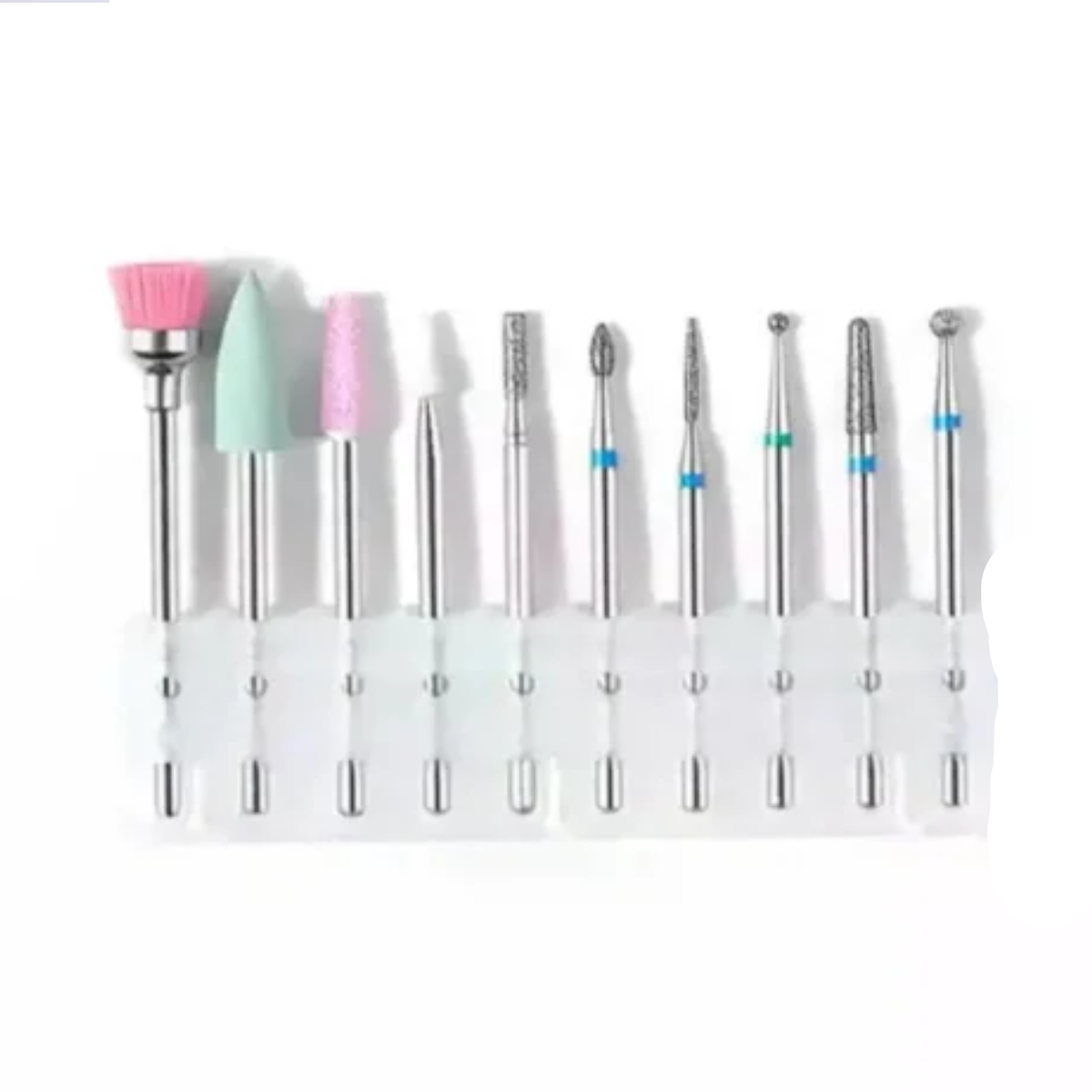 10 brocas de diferentes tamanhos e formatos, para atender a todas as necessidades de manicure.