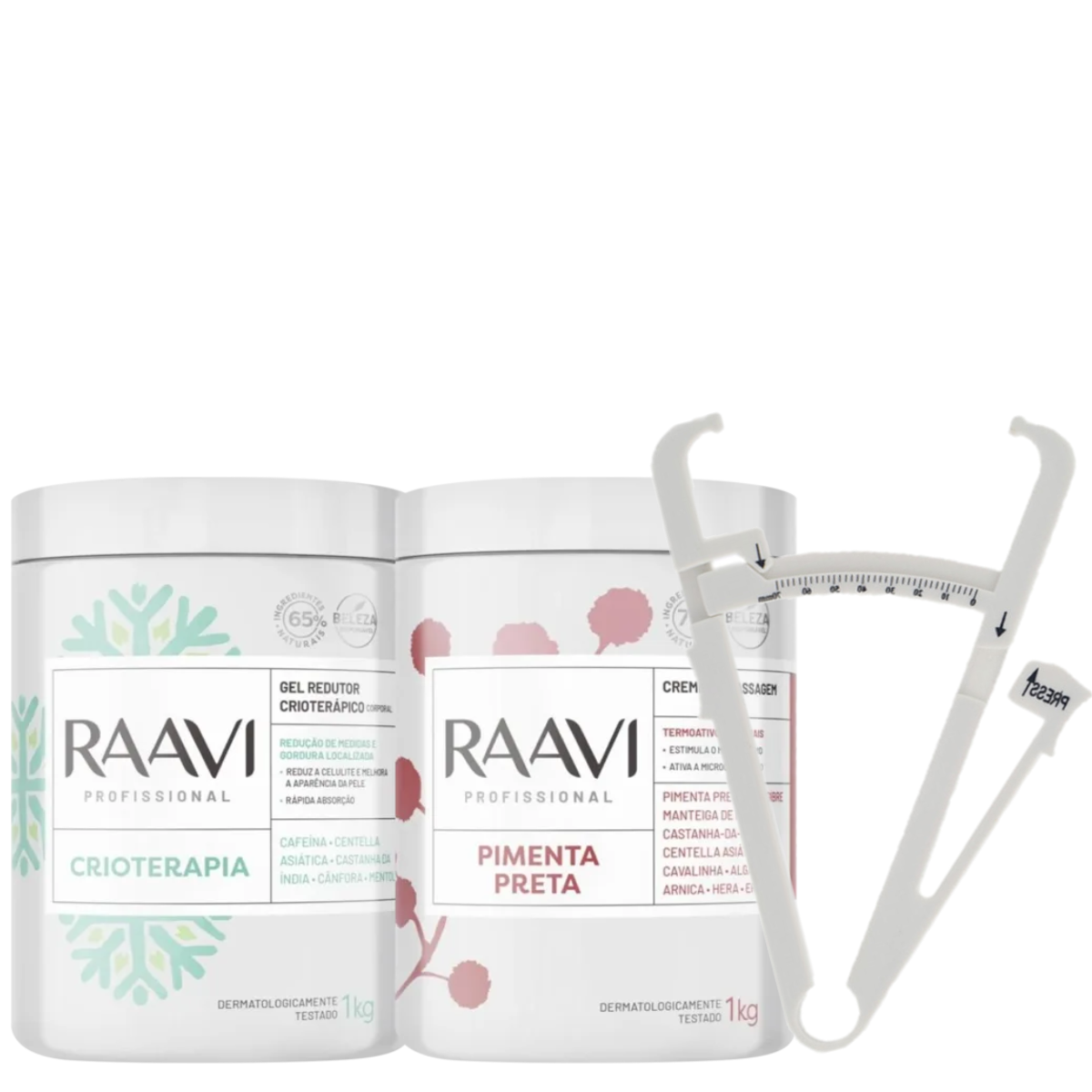 O Kit Raavi Cosméticos Massagem Crioterapia + Pimenta Preta conta com um creme para massagem Termoativo de Pimenta Preta que estimula o metabolismo a ativar a microcirculação. Com excelente deslizamento, é indicado nos tratamentos estéticos devido à sua ação vasodilatadora.