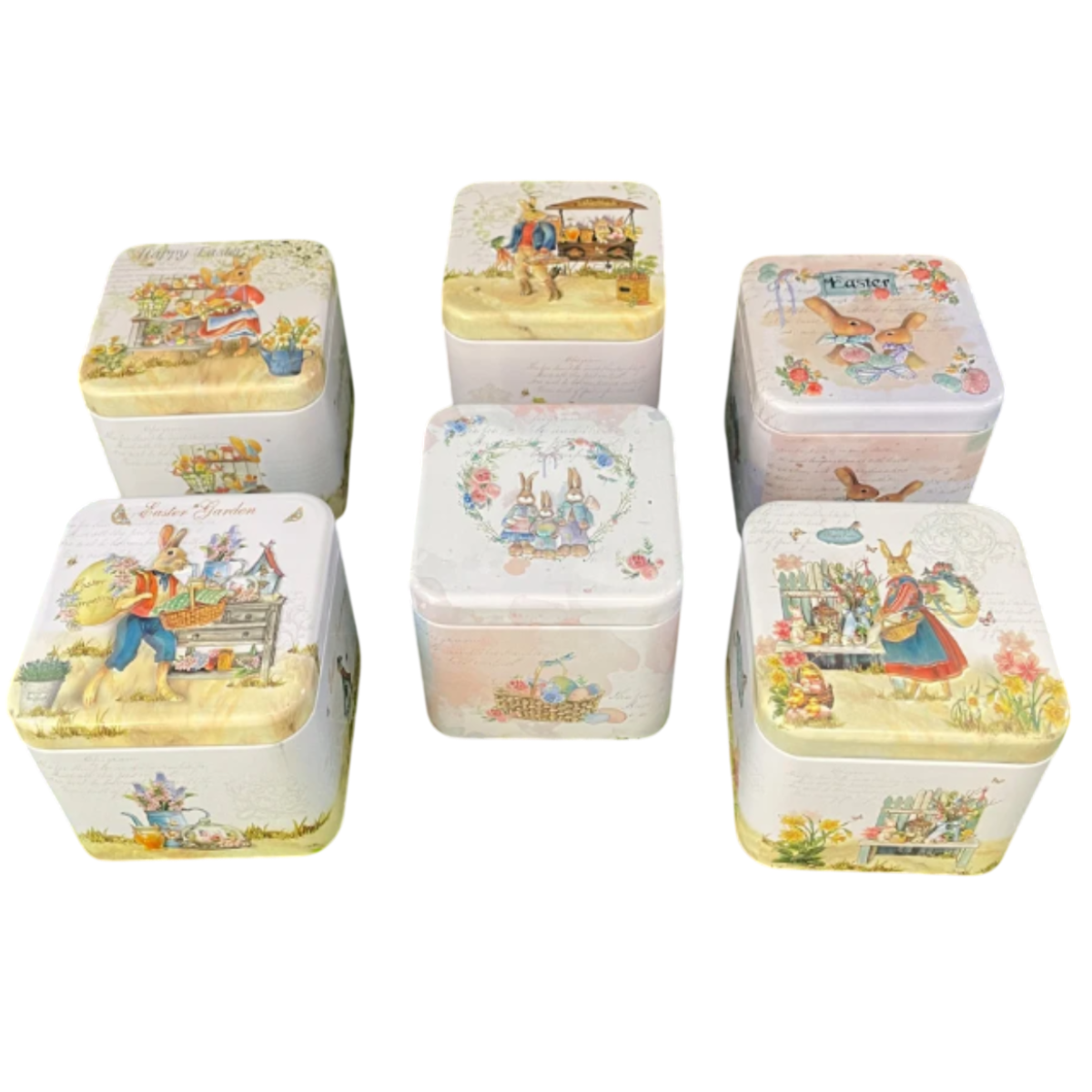 Esta pequena e delicada Lata Quadrada é perfeita para a Páscoa, adornada com desenhos temáticos encantadores. Um Belo Coelhinho, com cestas e florais enfeitam sua superfície com um toque de elegância e alegria.