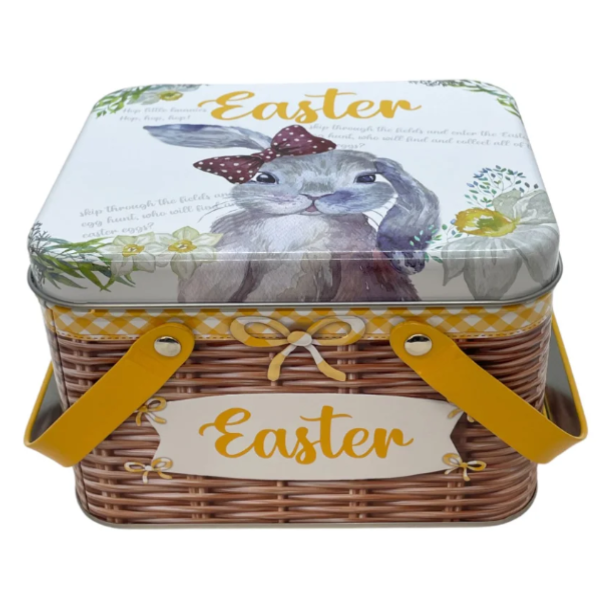 Esta charmosa Lata com Alça Dupla é perfeita para a Páscoa, imitando uma cesta trançada de bambu. Sua tampa é decorada com flores, folhagens e uma adorável coelha da Páscoa, capturando a essência da temporada.